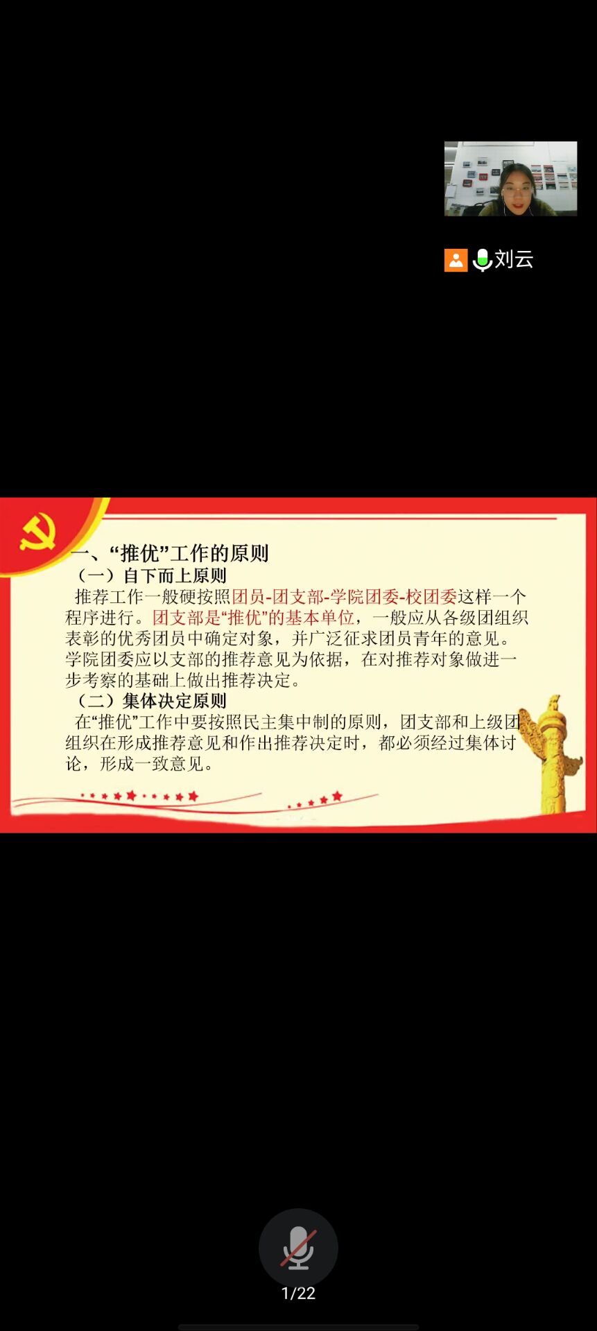 出于筑牢校园疫情防控安全屏障、持续做好疫情防控的需要,本期培训于线上进行。科学教育专业1901班栗秋璐同学担任本期培训主讲人,分别从“推优工作的原则”、“推优对象的范围条件”和“推优入党的基本程序”三方面对推优流程进行了详细介绍,进一步强调了推优入党的程序和关键环节,并就推优过程中的共性问题进行解答,在深化学员对推优工作的认识的同时提高了团组织推优工作的科学性和公信力。共青团推优入党是加强青年党员发展的一项重要制度设计,也是党赋予共青团的一项重要政治任务,有利于激发广大团员青年的政治热情,增强共青团组织吸引力和凝聚力。培训结束后,学员们纷纷表示,将在以后的学习生活中更加严格地要求自己,遵循团的章程,认真履行团员义务并积极向党组织靠拢。