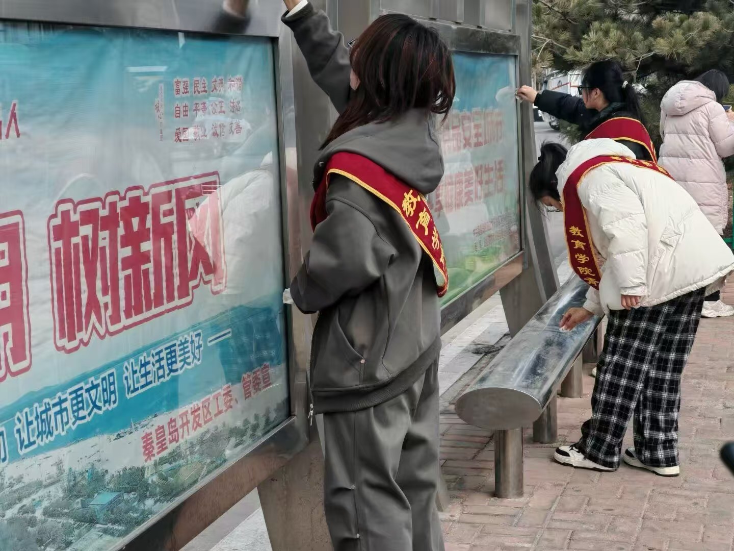 志愿者们按要求提前到达公交站点并携带好打扫工具,在负责人的带领下,有条不紊地对站点地面垃圾进行清扫,包括清除站点地面的垃圾和座位上的灰尘、污渍。在活动过程中,同学们态度端正,分工明确,高效地完成了本次清扫活动。