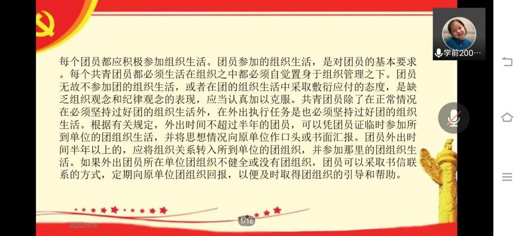 本次团课学习由学前教育2003班杨晨雨同学担任主讲,杨晨雨同学主要围绕共青团的组织生活和组织标志两个方面展开讲解,向学员们介绍了团支部组织生活的内容、制度及团旗、团徽、团歌和团员证等组织标志的含义,以此来引导学员积极参与团组织开展的各项活动,并接受团组织的教育和监督。在学习过程中,应用心理学2101班孔梦泽、小学教育2102班邢志彤、科学教育2102班史佩雨等同学积极配合团课的开展,主动为大家朗读课件内容。团课结束后,学员们纷纷表示,团的组织生活制度是团组织对团员和团干部进行管理、教育和监督的基本形式,每一名共青团员都应及时向团组织汇报工作情况,主动提高自身的组织观念和思想觉悟,帮助团组织系统正常运转。