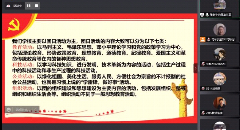 本次团课由教育技术学2001班张新宇同学担任主讲人,她主要围绕团的活动这一主题,详细介绍了开展团日活动的意义、可开展的活动类型与形式等多项内容,为学员们讲授了一堂生动鲜活的思政教育团课。此外她还强调,团日活动是联系团支部与同学们的桥梁,深入开展团日活动才能更好地活跃基层组织、体现共青团的青春风采。最后,她鼓励全体学员积极加入到团日活动的策划与实施之中,在实践中修炼自我,在奋斗中增长才干,争做立大志、明大德、成大才、担大任的青年。团课结束后,学员们纷纷表示:作为一名合格的共青团员,要在奋斗中勇担青春使命,在干事中激荡青春理想,创造无愧于党和人民、无愧于时代、无愧于青春、无愧于家乡的光辉业绩,以优异成绩迎接党的二十大胜利召开。