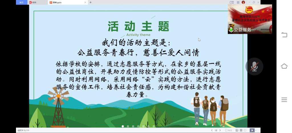 七支优秀队伍参加了本次答辩,分别是公益服务青春行队、公益服务奉献团、公益小纵队、红鹰队、冀青春队、守望先锋队、新兴之火队。每个团队都能根据各自擅长的科研方法,充分发挥组内成员的专业优势、人脉优势,在组内进行合理分工,保证项目的顺利进行。答辩会上,冀青春队从项目概述、项目内容、团队分工、目标成果和实践意义五个方面阐述了本队的项目构想,队伍充分发挥小组成员专业多元化、地点多元化的实践优势,重点对“教育关爱”、“生态文明”、“智慧乡村”三个方面进行研究。公益服务青春行队则以“公益服务青春行,慈善仁爱人间情”为主题,将开展“到岗实践”、“基层实践”、“公益实践”和“网络云实践”四个方面的实践内容。红鹰队从时间主题、团队概括、可行性分析三个方面进行了项目介绍,他们以“党员思想教育相关表述”为主题,项目具有“实践方式多”、“实践地点多”、“可视、内化的实践成果”等优势。答辩结束后,每队的指导老师和队长进行了实名制投票,其中冀青春队与红鹰队获得的票数最高。