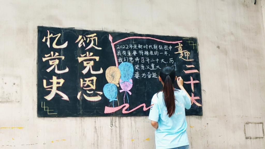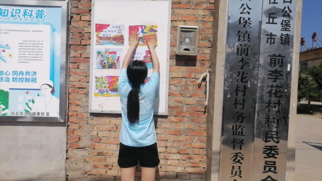 实践过程中,团队成员在经过村委会和居委会的同意后,在村镇和社区的宣传栏绘制和张贴以“迎接二十大,奋斗新征程”为主题的手抄报、宣传画,让村民和居民进一步领悟中国共产党的领导是党和国家的根本所在、命脉所在,是全国各族人民的利益所系、命运所系,鼓励群众以实际行动迎接党的二十大的胜利召开。