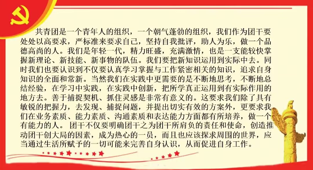 20级学前教育专业杨晨雨同学担任本次培训会的主讲人,她从“团干部的含义”和“团干部的特点”两方面展开叙述,详细介绍了团干部在员工群体中发挥的重要作用。她指出,共青团组织是党的后备军,更是团结广大青年的纽带,一名合格的团干部应自觉提升自身素质和能力,将广大青年最广泛、最紧密地团结起来,和党一起干事创业。最后,她鼓励学员们坚定理想信念、练就过硬本领,将党的声音传递到更广泛的青年中去,以青春为笔,书写不忘初心、砥砺前行的新篇章。
