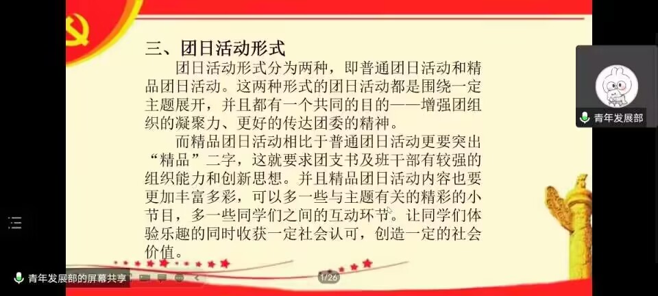 为传达团委精神,加强基层团组织建设,增强学员对团日活动的了解,2022年10月24日19:00,304永利集团于线上开展第八期星火干校第四讲及入团积极分子培训第四讲,198名学员参与此次培训。
