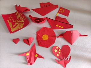 活动过程中,同学们创作了“双收托起五星红旗”,一双有力的大手托起鲜艳的五星红旗,象征着人民对国家的热爱和守护;“红日初升”,用卡纸剪出一轮红日,周围环绕着光芒,寓意着中国共产党如初升的太阳,照亮了中国革命的道路;“守护祖国大好河山”,用颜料在卡纸上绘制出壮丽的山河,表达了对祖国大好河山的热爱和守护的决心;“五星红船”,用红色和黄色卡纸塑造出南湖红船,船上点缀着五颗星星,象征着中国共产党从南湖红船启航,开启了伟大的革命征程。