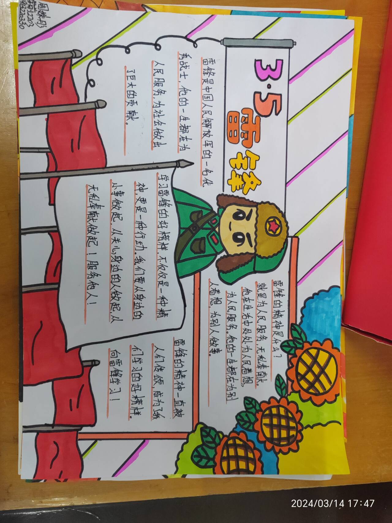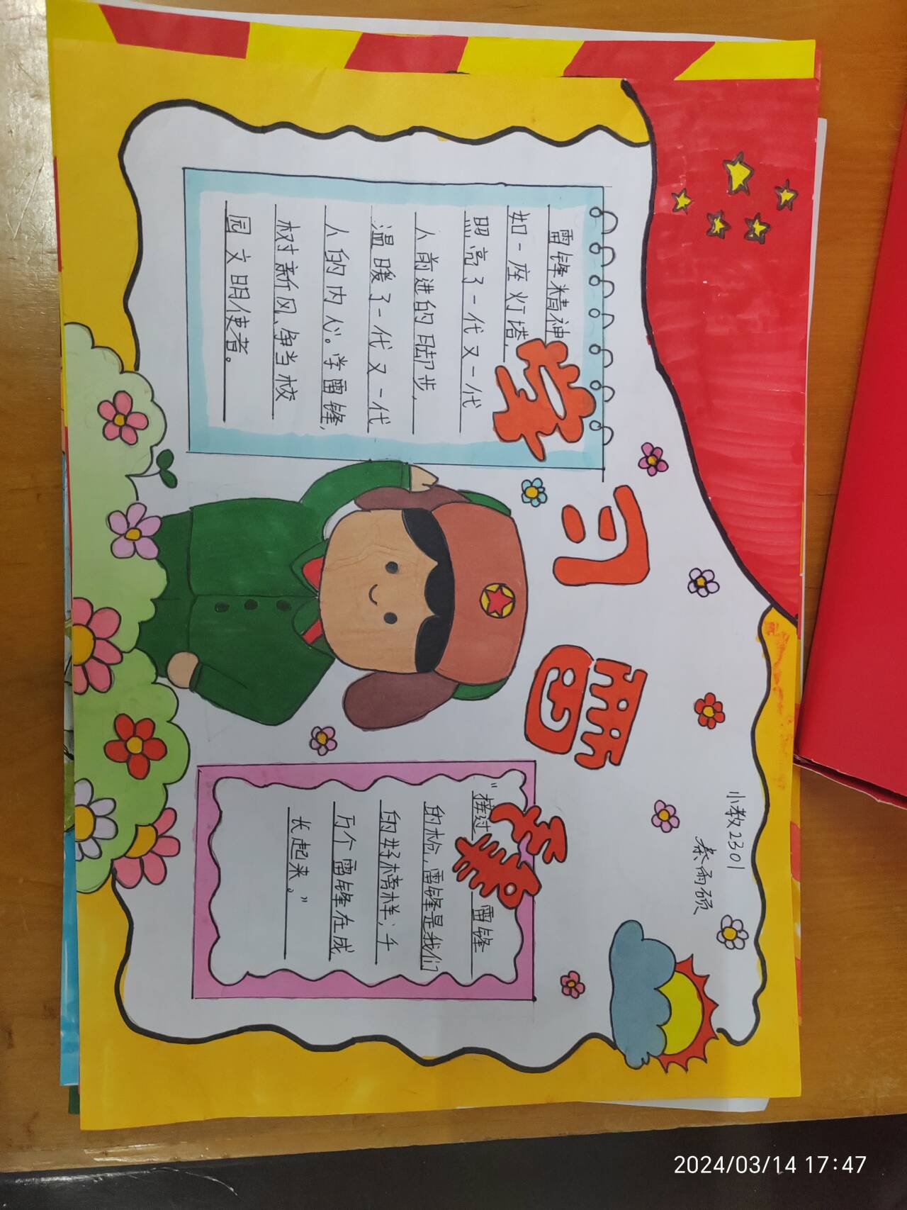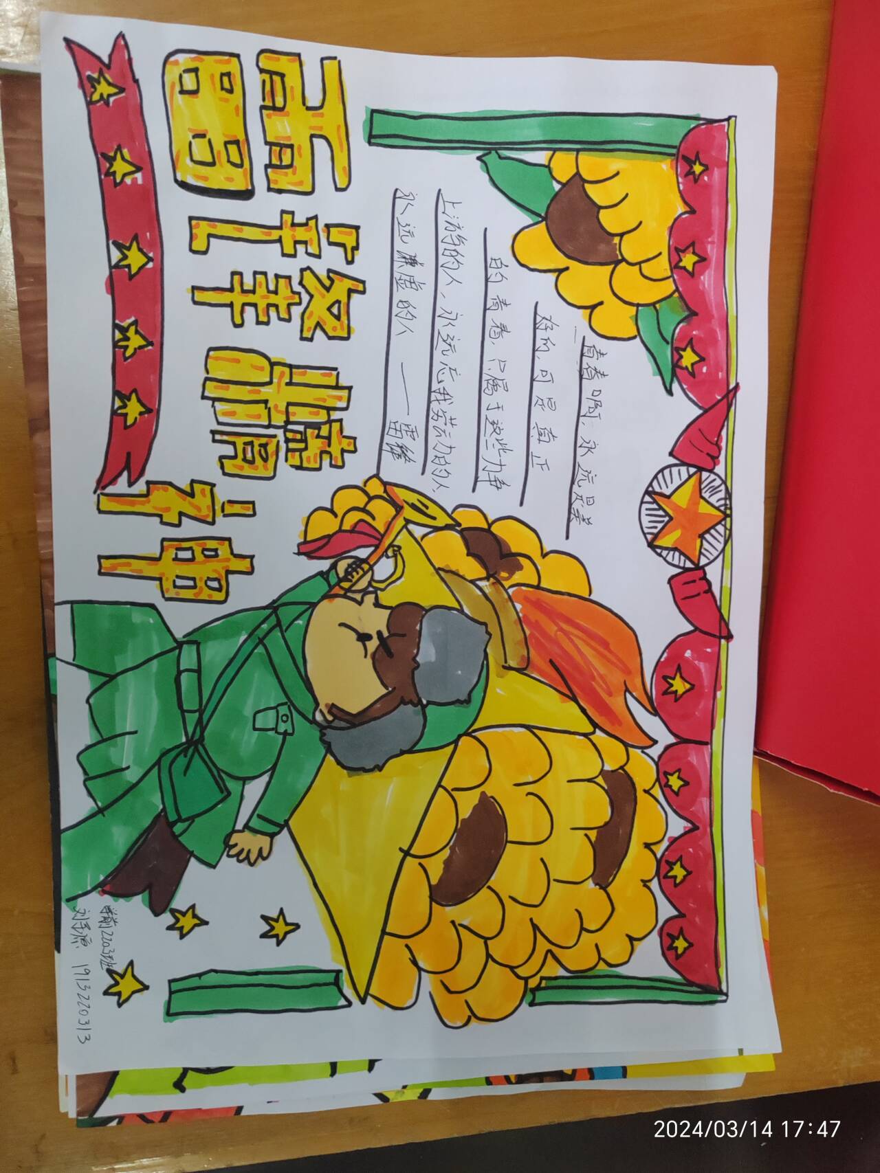 活动中,志愿者自行准备A4纸、水彩笔等活动用具,并上网搜集、学习有关雷锋精神的内容。手抄报整体以雷锋精神的内涵为主体,志愿者结合雷锋同志的光荣事迹及其精神,充分发挥自己丰富的想象力和创造力,展现出雷锋同志的高尚品格和卓越品行。通过本次绘画活动,红色血脉逐渐步入同学们的视野,让雷锋故事获得更多人的关注,让雷锋精神真真切切地贯彻到了个人的全面发展和成长中,