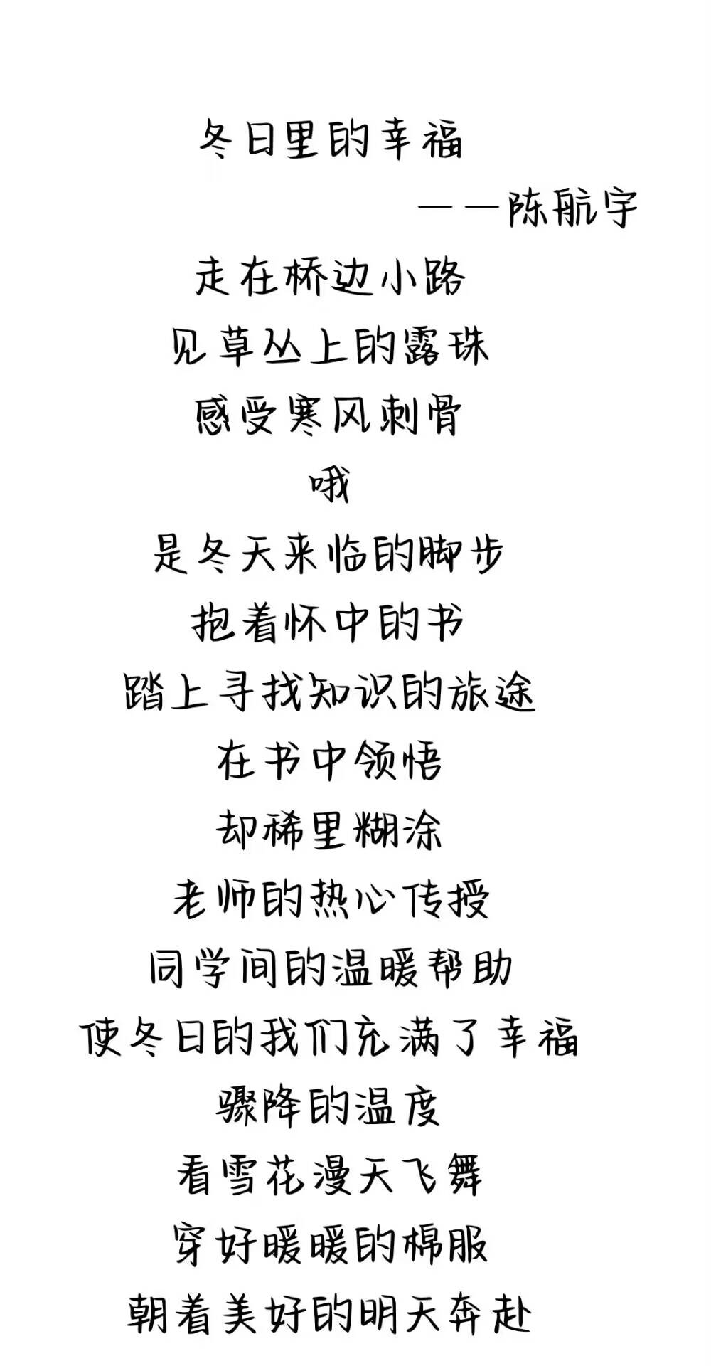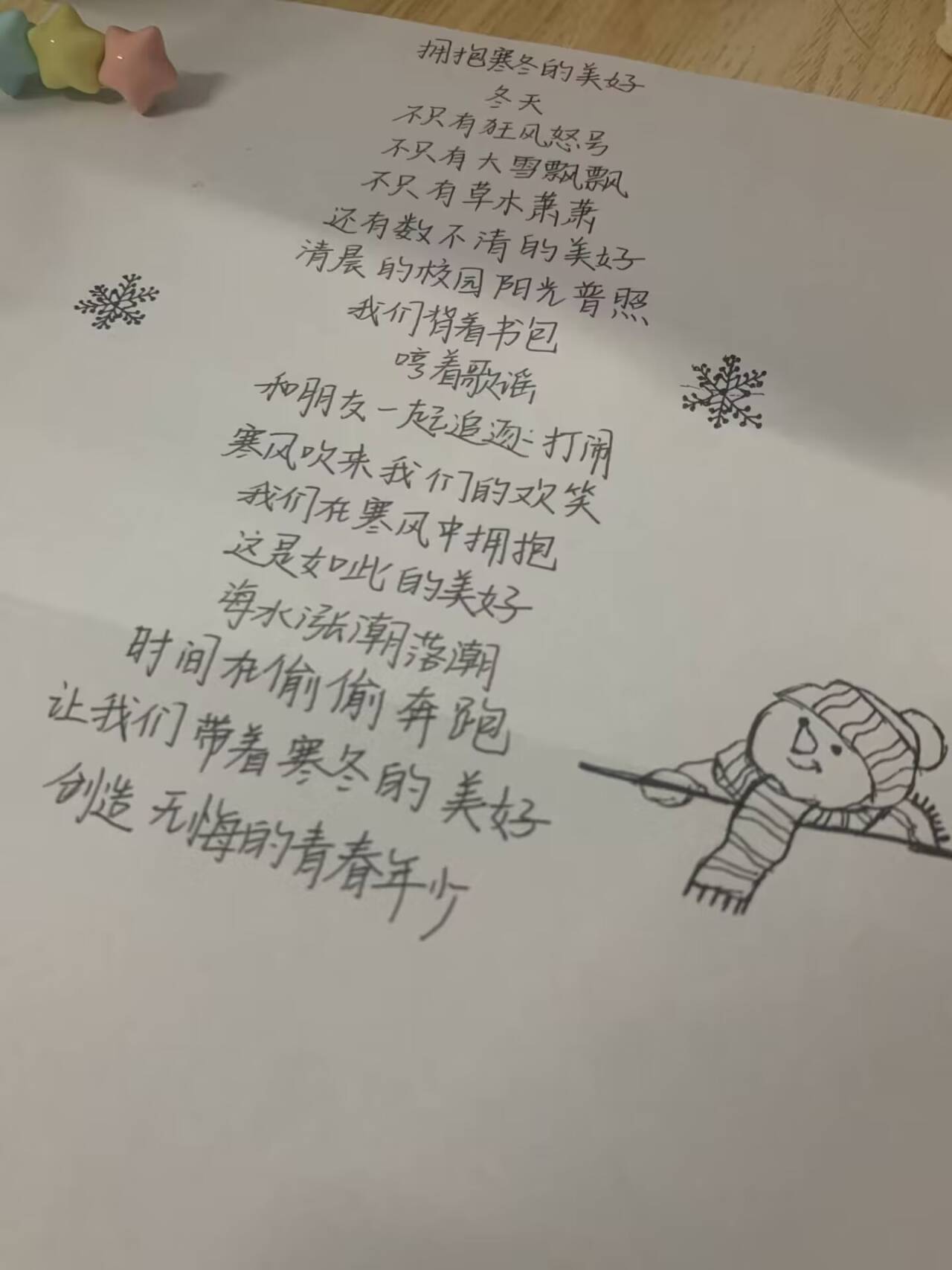 同学们围绕活动主题寻找创作素材,潜心创作出自己的诗歌,以迎接冬日的到来。接着,同学们拍摄自己深情朗诵诗歌的视频,搭配在校园内的日常碎片剪辑出品,并按要求上交材料。在活动过程中,同学们体会到创作的不易,也感受到中华诗词文化的美,这也促使员工更能通过自己作诗、写文来记录生活中发现的美好,感受中华文化的博大精深。