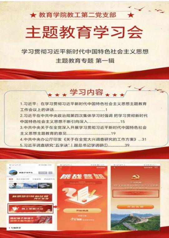 支部书记李建英详细介绍本次集中主题学习的内容,并谈及后续支部学习活动要结合学习强国平台—河北学习平台的“学习宣传党的二十大精神网上答题活动”及“学习贯彻习近平新时代中国特色社会主义思想主题教育答题活动”,实现以赛促学,以学促干。支部委员王亚男老师领读领学,与会全体党员共同学习了“习近平:在学习贯彻习近平新时代中国特色社会主义思想主题教育工作会议上的讲话”“习近平在中共中央政治局第四次集体学习时强调 把学习贯彻新时代中国特色社会主义思想不断引向深入”“中共中央关于在全党深入开展学习贯彻习近平新时代中国特色社会主义思想主题教育的意见”“中共中央办公厅印发《关于在全党大兴调查研究的工作方案》”及“习近平调查研究“五字诀”|跟总书记学调研①”。学习会上,支部党员重点学习并研讨习主席谈调查研究,围绕习主席提到的多样化运用各种调研方法,如发放问卷、请教专家,到蹲点调研、解剖麻雀等结合自身教学科研实际进行反思,纷纷表示在今后的教学科研中一定灵活多样运用调研方法,要见实效,运用调研方法针对突出问题、重点问题研究。