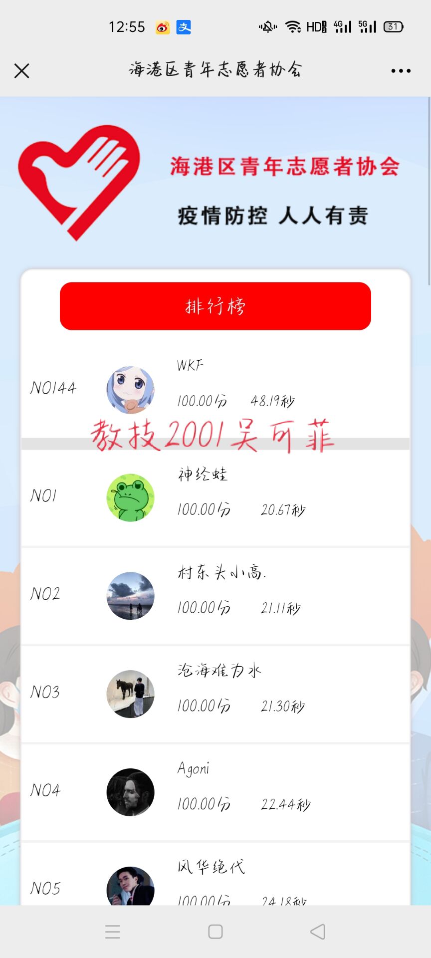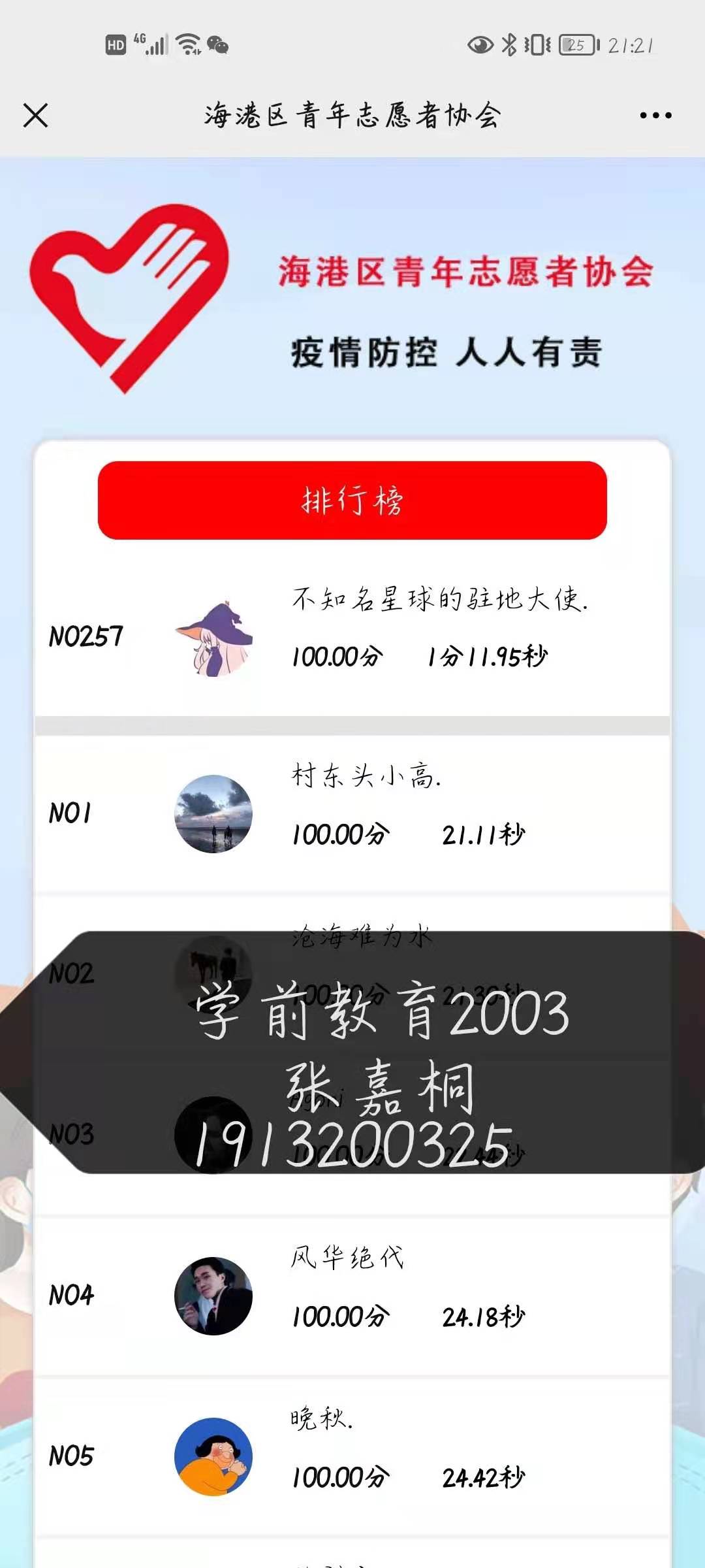 本次疫情防控答题活动由海港区青年志愿者协会主办。活动开始前,公司青协人员提前问询了活动答题的相关事项,确定下活动形式并发布通知召集志愿者,为活动的顺利进行打下了良好的基础。号召一经发出,便得到了同学们的积极响应,大家纷纷报名参加答题活动。活动期间,志愿者们填写好自己的身份信息,扫描答题链接进入答题界面开始答题,并在答题结束后将成绩排名界面截图,标注好专业班级姓名发送给班级负责人。活动结束后,学前教育专业2003班张嘉桐同学如是说:“疫情防控无小事,我们要从自我做起,从身边的小事做起,一起筑牢安全防线!”