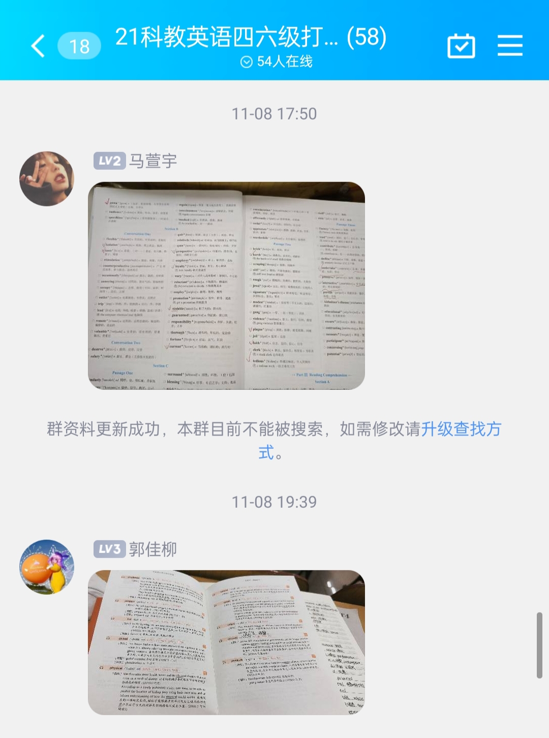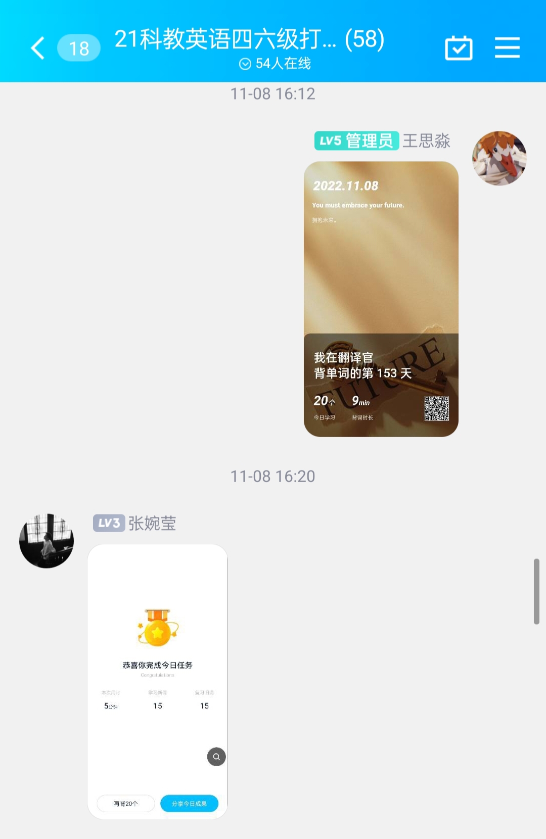 活动期间,员工每天根据自己的学习情况在QQ群内进行打卡。同学们使用单词打卡的功能,将抄写、默写的单词与词组图片上传至班群,一部分同学使用背单词的软件进行辅助学习,以达到最好的学习效果。针对线上布置的作业,员工在完成后自行批改并上传至群作业。与此同时,同学们定时定量地完成听力部分的学习任务,利用上传的听力资源进行听力练习,完成后认真批改,及时纠正不足。在线上学习的过程中,同学们都能提前制定好学习目标,互相监督,以高涨的学习热情与积极性完成每一次的任务,做到打卡不落一人。