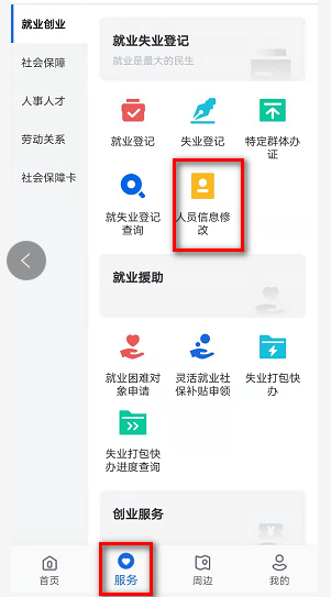 6.登录成功之后选择最下方的服务按钮,找到左边的就业创业板块下的就业失业登记——>人员信息修改。