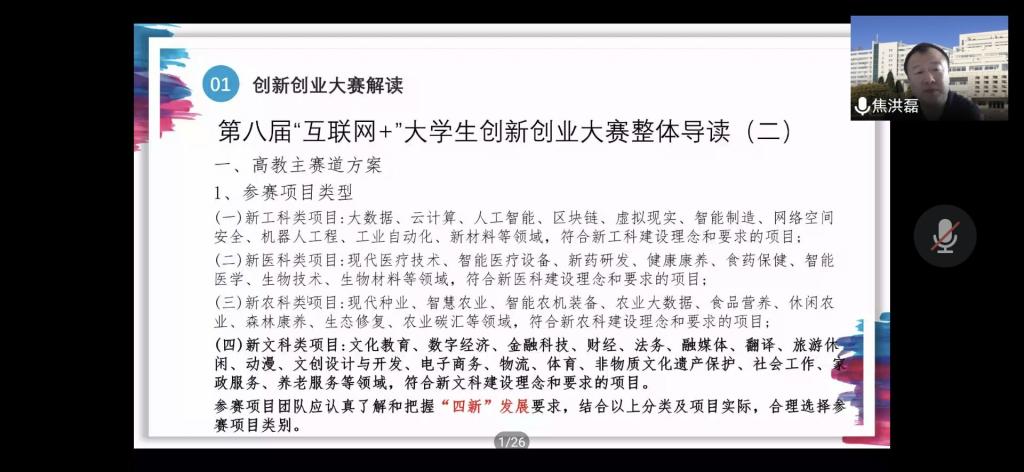 为进一步扎实推进公司第八届中国国际互联网+”老员工创新创业大赛项目培育及备赛工作,挖掘公司创新创业有志青年及优质项目,助力师生备战互联网+”大赛,20226189:00,公司开展“互联网+创新大赛”线上培训讲座。本次讲座由焦洪磊老师主讲,学工办万玉良老师主持。
