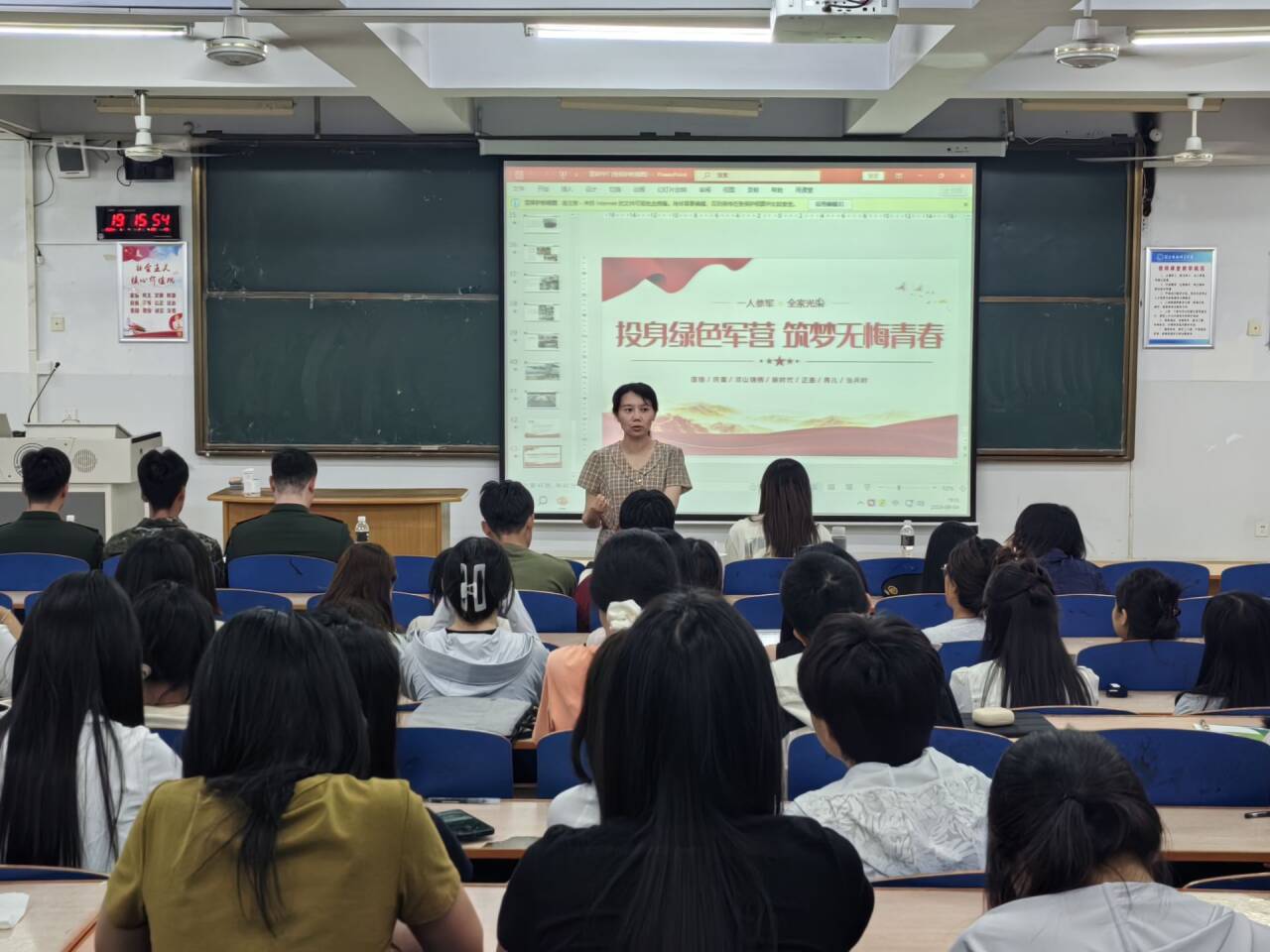 21应心的刘思通、23小教的陈志豪和22科教的金智骁三位同学从军事常识、老员工入伍优惠政策、应征入伍条件、应征入伍流程、发展前景与退役保障、军营生活六个方面进行讲解,他们通过播放自己部队日常训练的短片分享各自的入伍经历以及参军的收获与成长,鼓励同学们投笔从戎,报效祖国,实现自身价值。