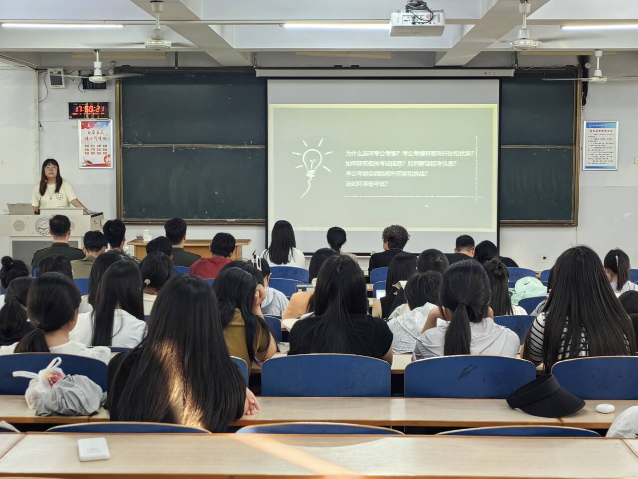 宣讲会上李思哲老师针对当前的就业环境进行剖析,介绍了三支一扶、特岗教师、西部计划等基层就业项目,鼓励同学们到西部去、到基层去、到祖国最需要的地方去,为建设祖国贡献自己的力量。随后李思哲老师围绕如何高质量备考政策性岗位进行详细解读,帮助员工了解考公考编等公职类考试的报名条件、考试内容、考试形式等,为其备考提供指导,为员工未来职业规划开辟了新思路。李老师还结合自身经历为大家介绍了当前形势下考公考编面临的困难挑战以及如何应对当前考试,鼓励同学们不要将目光只局限于考公考编,要在适合自己的岗位上发光发热。最后李老师向同学们强调了求职过程中的安全问题,谨防求职陷阱,要从官方渠道获取求职信息,并为同学们提供了获取就业信息、拓宽就业渠道的平台。