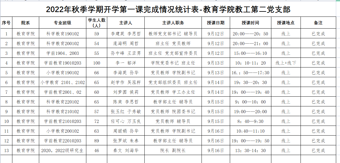 近日,公司教工第二党支部开展了秋季学期“开学第一课”主题党日活动。本支部参与包联班级的15位党员教师于9月12日—16日期间为包联的科学教育、学前教育、小学教育3个专业,29个教学班的本科老员工及2020级研究生讲授秋季学期“开学第一课”。
