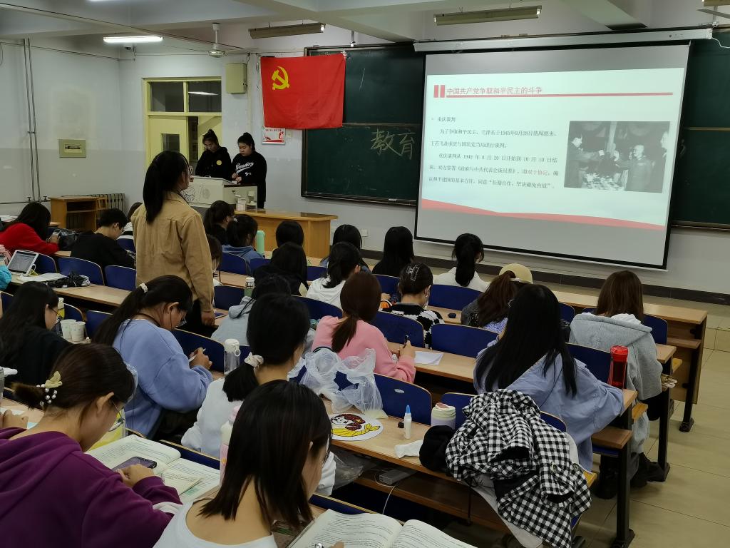 学前教育专业1802班梁子瑶、林舟辰同学以“新中国的成立”为主题,从“和平谈判到自卫战争”、“政治协商新格局”、“中国革命胜利的原因和基本经验”三个方面阐述了中华民族从站起来、富起来到强起来的伟大历程,使同学们深刻意识到新中国成立的艰辛与不易。紧接着,同学们齐声朗诵了毛主席所著的《七律·人民解放军占领南京》,在词句中感受着解放军击垮国民党反动派的决心。最后,大家纷纷表示一定会努力学习,树立正确的人生观、价值观、世界观,为实现伟大复兴的“中国梦”而奋斗终生。
