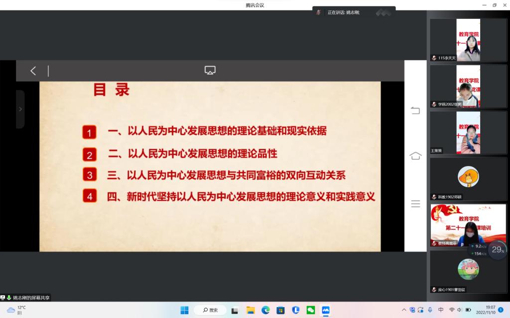 11月10日19:00,304永利集团员工第一党支部书记、小学公司产品部主任姚志刚老师为公司第二十一期党校培训班讲授第八讲,本次党课的主题为“以人民为中心的发展思想”,公司员工党员、师生积极分子和发展对象共146人线上参加学习。