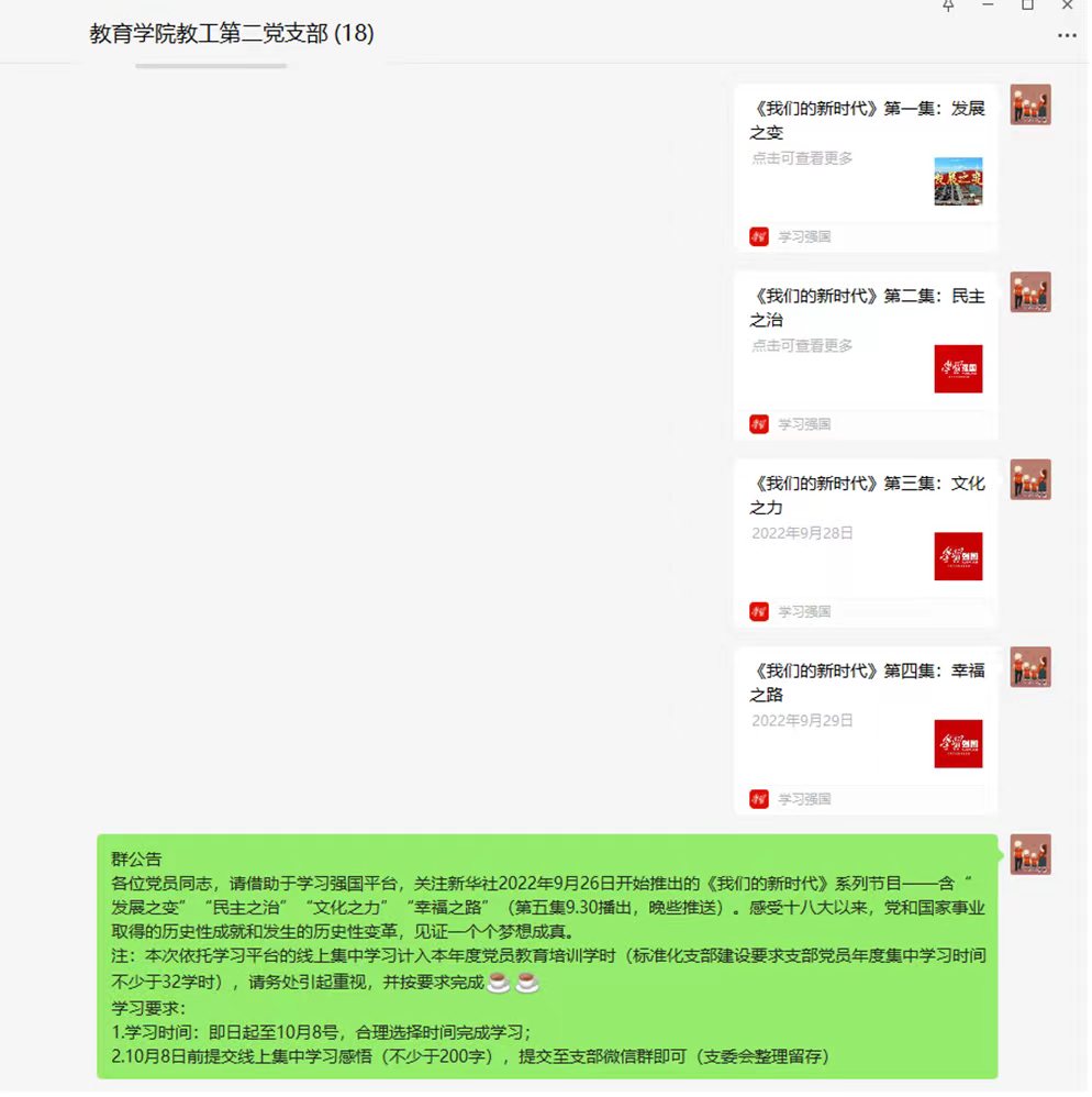9月28日——10月8日期间,304永利集团教工第二党支部开展了《我们的新时代》党员教育培训活动。支部内全体党员借助于学习强国平台,系统学习了新华社推出的《我们的新时代》五集系列节目——“发展之变”“民主之治”“文化之力”“幸福之路”“绿色之美”,并在线上交流了学习感悟。