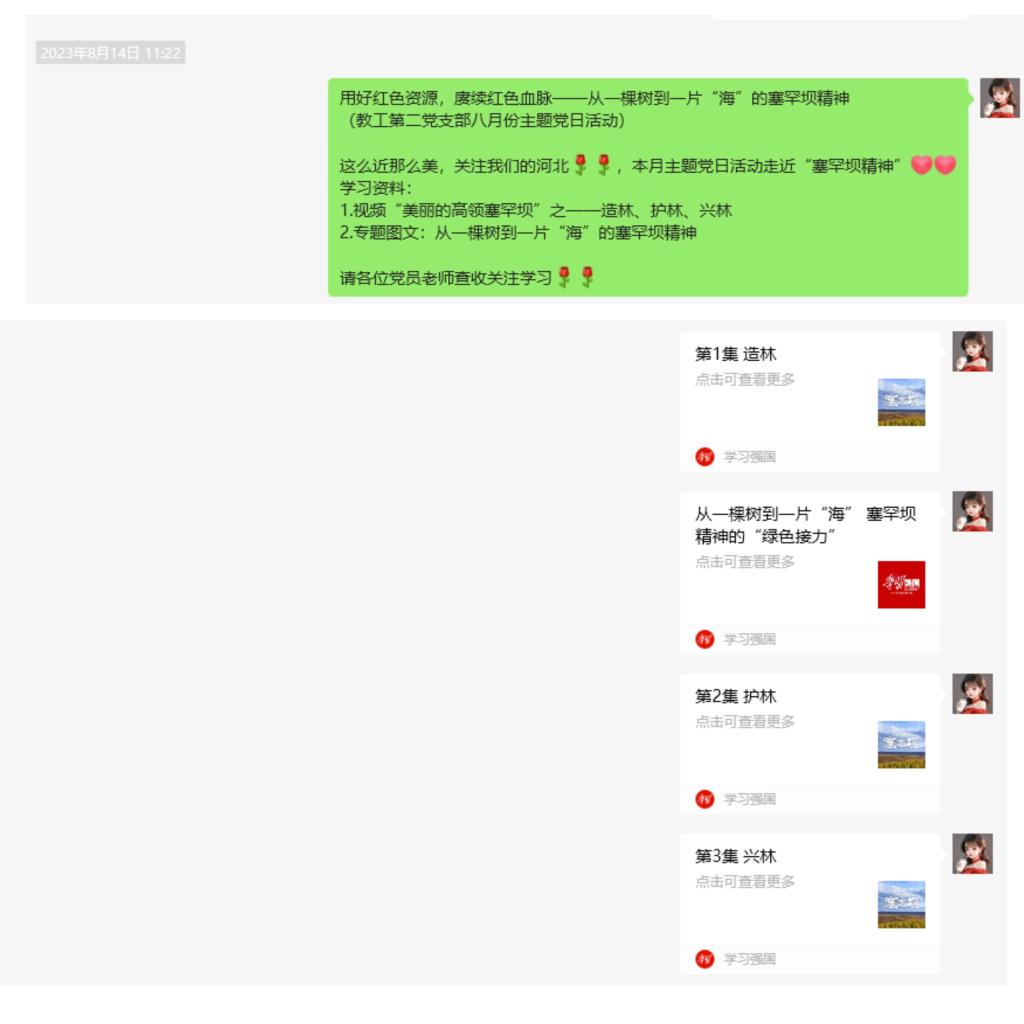 本次主题党日学习活动依托学习强国资源,以线上学习+党小组交流研讨形式开展。支部党员们通过线上观看系列视频“美丽的高岭塞罕坝——第1集:造林,第2集:护林,第3集:兴林”和专题图文“从一棵树到一片‘海’的塞罕坝精神”进行塞罕坝精神专题学习。三代塞罕坝林场建设者们,听从党的召唤,用六十载的光阴,用青春与奋斗,创造了“荒原变林海”的奇迹,以实际行动诠释了“绿水青山就是金山银山”的理念,铸就了“牢记使命、艰苦创业、绿色发展”的塞罕坝精神。